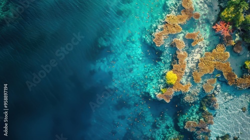 Aerial View of Vibrant Coral Reefs and Clear Blue Ocean Waters Teeming with Marine Life