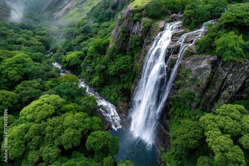 waterfall, forest, nature, aerial view, landscape, green, tree, water, cascade, lush, jungle, rainforest, rock, cliff, mountain, scenery, environment, wilderness, tropical, vibrant, flowing, stream, river, photo, travel, adventure, destination, scenic, beauty, natural wonder, conservation, ecology, biodiversity, habitat, ecosystem, peaceful, serene, tranquil, remote, untouched, pristine, summer, spring, outdoors, aerial photography