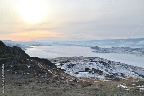 Aerial View of Winter Landscape of Frozen Lake Baikal from Top of Trident Rocks in Russia
