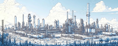 Aerial View Oil Gas Terminal Line drawn concept. Highly detailed line art of an aerial oil and gas terminal, featuring a vast network of pipelines, fuel tanks, and transportation infrastructure