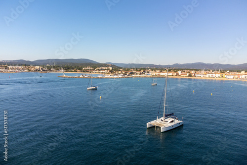 Aerial view on Gulf of Saint-Tropez, sail boats, houses of Port Grimaud and Port Cogolin, summer vacation in Provence, France
