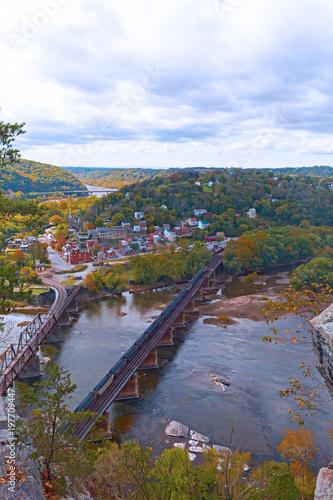 Aerial view on Harpers Ferry historic town and the rail bridge from the park overlook. Railroad bridge, mountains and river banks in fall, West Virginia, USA.