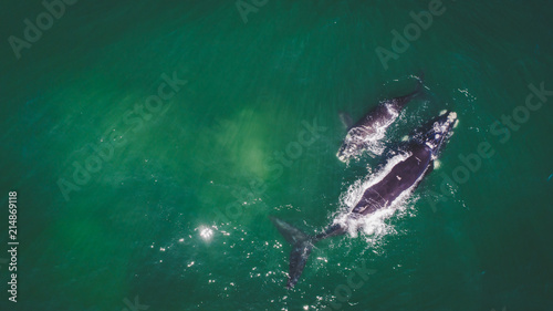 Aerial view over a Southern Right Whale and her calf along the overberg coast close to Hermanus in South Africa