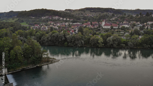 Aerial view over Aare river, to the church and residential area of Umiken and Riniken, Switzerland.