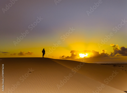 Aerial view over the dramatic sand dunes of the Parque Natural at sunrise near Corralejo in Fuerteventura Canary Islands Spain