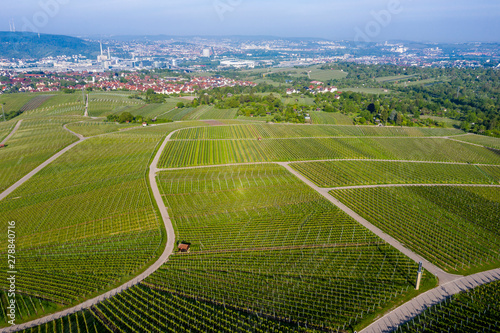 Aerial view over vineyards at Kappelberg in spring, Bad Cannstadt, Fellbach, Germany