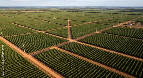 aerial, farm, agriculture, plantation, crop, field, landscape, rural, row, green, tree, earth, path, pattern, land, nature, countryside, cultivation, farming, vista, scenery, geometric, precision, order, arrangement, perspective, view, environment, growth, horizon, open, area, cultivated, system, grid, infrastructure, supply, line, utility
