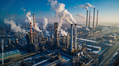 factory, industry, plant, building, structure, pipe, smokestack, chimney, smoke, pollution, emission, environment, air, steam, cloud, sky, blue, aerial, view, complex, manufacturing, production, processing, infrastructure, tube, metal, steel, construction, energy, power, chemical, refinery, industrial, site, landscape, process, gas, heavy, large, modern, technically, urban, cold, winter, outside, daylight, operation, detail