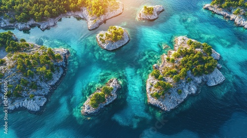 Aerial view turquoise sea, green islets, sunny day, calm waters, travel brochure