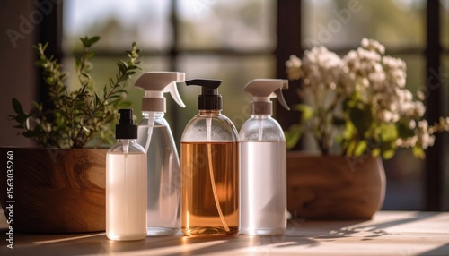 Aesthetic arrangement of eco-friendly cleaning products on a wooden table with plants and natural light.