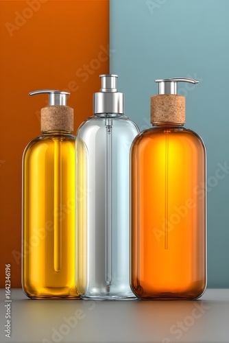 bottle, glasses, liquid, pump, dispenser, bathroom, hygiene, soap, shampoo, lotion, beauty, container, skincare, product, minimalist, modern, still life, orange, blue, cosmetic, treatment, transparent, amber, clear, gold, surface, wooden, lid, cap, studio, indoor, closeup, no people, composition, contemporary, presentation, design, cleanliness, well-being, health care, lifestyle, routine, organisation, elegant, sophisticated, refined, still