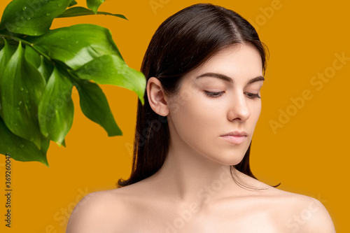 Aesthetic cosmetology. Perfect skin. Portrait of woman with fresh smooth clean face bare shoulders with exotic plant green leaves isolated on orange. Organic hygiene beauty.