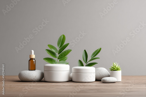 Aesthetic skincare presentation. Features minimal containers with green plant sprigs, set on stones, showcasing natural beauty.