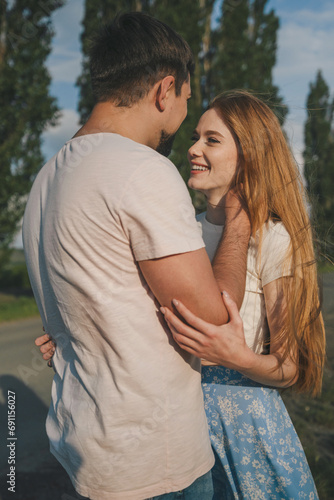 Affectionate couple meeting in a place far from humanity, man and woman in love cuddling together, enjoying date in nature. Happiness concept.