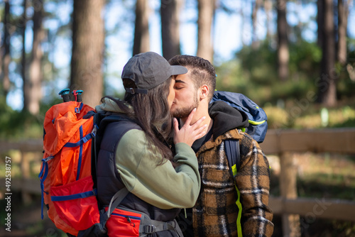 Affectionate couple of young hikers. Caucasian man with beard and woman in cap with big backpacks kissing in forest. Hobby, nature, love concept