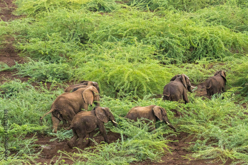 aerial, elephant, endangered, green, herd, horizontal, lush, nobody, outside, rift valley, safari, travel destination, tusk, walk, wildlife