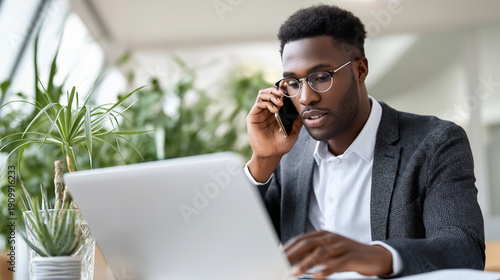 African American businessman employee working in office setting, professional workplace environment, corporate employment representation, modern business activity, with copy space