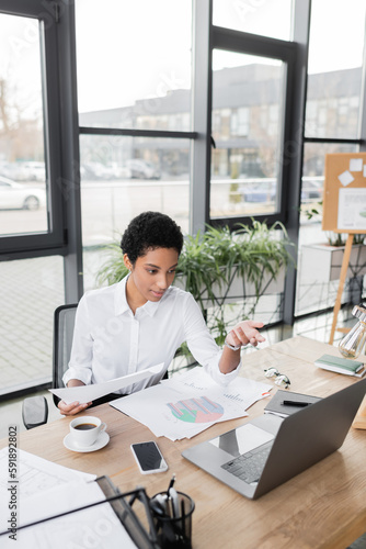 african american businesswoman holding documents and gesturing near laptop during video call in office.