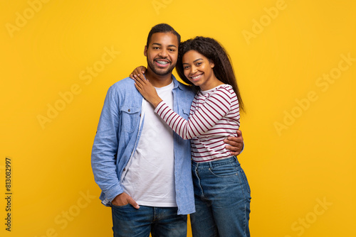 African American couple standing side by side in front of a bright yellow background. They are looking directly at the camera, both wearing casual clothing, embracing