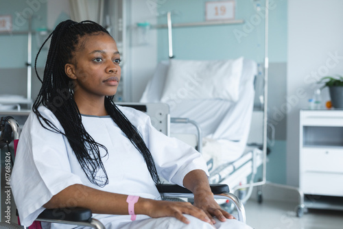 African american female patient wearing hospital gown, sitting in wheelchair in hospital room