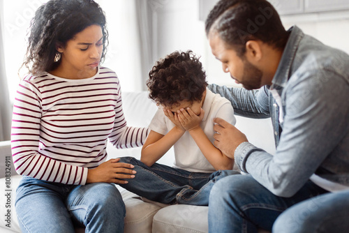 African American man and woman are seated on a couch, accompanied by a child. Parents comforting their upset crying child, home interior