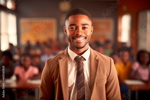 African american man teacher in classroom with arms crossed, looking at camera with learning students on background . cheerful education from elementary to university, education concept