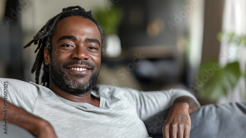 mature adult, dreadlocks, smiling, indoor, home interior, casual clothes, portrait, content, wellness, lifestyle, leisure time, relaxation, happiness, beard, grey shirt, sofa, living room, friendly, serene, authentic