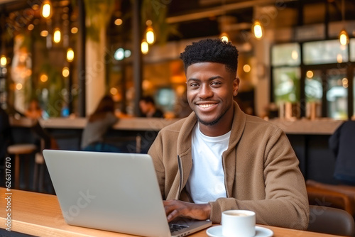 African American man working on a laptop computer in a busy cafe, a portrait of a successful person