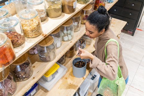 African American woman buying organic tea in local zero waste grocery store. Woman smells organic tea in sustainable grocery store.