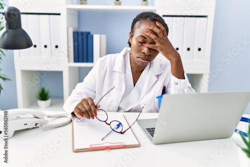 African american woman doctor stressed working at clinic