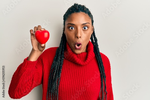 African american woman holding red heart scared and amazed with open mouth for surprise, disbelief face