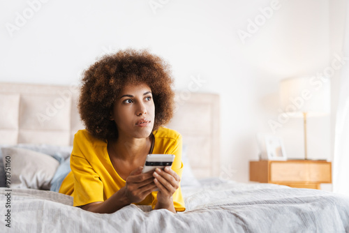 woman, home, joy, portrait, shopping, using, mobile phone, young, copy space, technology, joyful, lifestyle, lying, light, vertical, screen, clothes, make-up, enjoy, model, beautiful, skin, room, holding, charming, fashionable, glamour, face, female, pretty, casual attire, elegant, person, appearance, online, coiffure, coiffure, communication, curly, adult, stylish, african, hair, gorgeous, smartphone, style, attractive, background