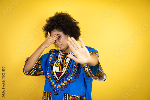 African american woman wearing african clothing over yellow background covering eyes with hands and doing stop gesture with sad and fear expression. Embarrassed and negative concept.