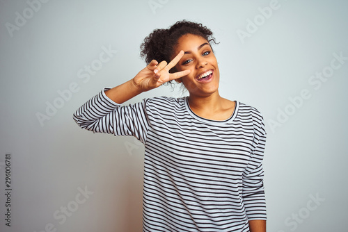 African american woman wearing navy striped t-shirt standing over isolated white background Doing peace symbol with fingers over face, smiling cheerful showing victory