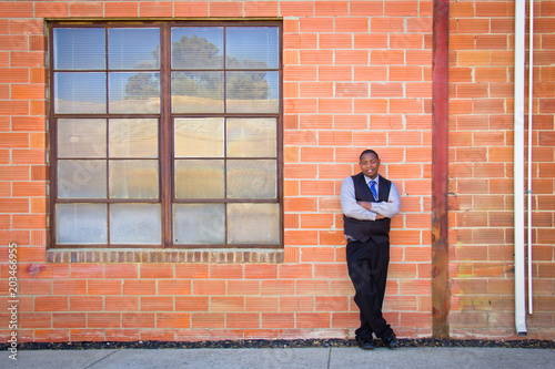 african american, male, man, young, black, short hair, red, brick, brick wall, dressed up, attaching, vest, slack, long sleeve, posed, arms crossed, confident, bold, business, people, businessman, building, window, architecture, suit, wall, walking, city, office, person, house, street, portrait, guy, door, executive, photogenic, boy, man, alone, outdoors