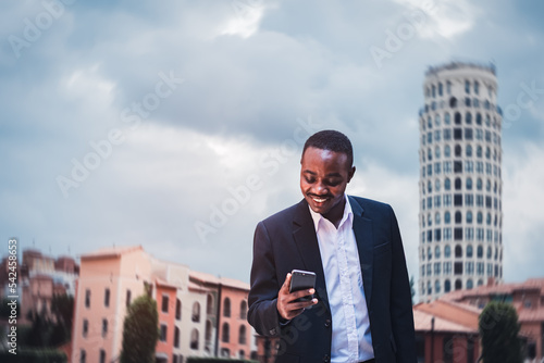African businessman holding smartphone with wearing suit outside residential property in city town