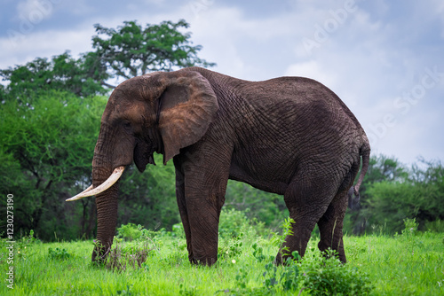 African Elephant Grazing in Green Fields