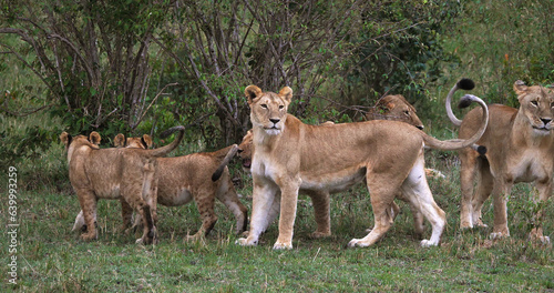 African Lion, panthera leo, Mother and Cub, Masai Mara Park in Kenya