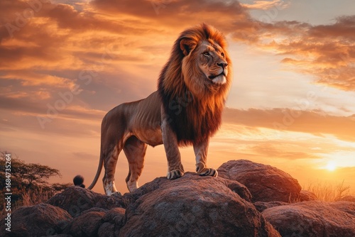 African Lion with a Golden Mane and Powerful Aura at Dawn in the Savanna