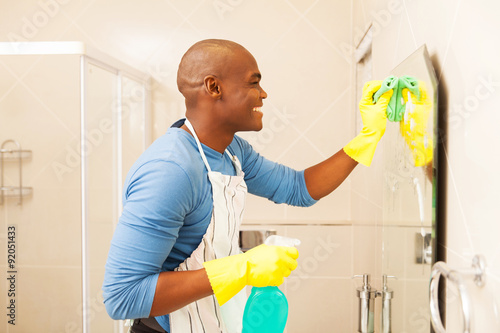 man, bathroom, cleaning, house, cleaner, laundered, housework, chore, mirror, home, guy, cleanup, young, clothes, wiping, household, adult, domestic, portrait, duty, ethnic, african, african american, black, apron, apartment, modern, casual attire, male, housekeeping, spray, cleanliness, happy, smiling, liquid, product, tidy, indoor, hygiene, bottle, photogenic