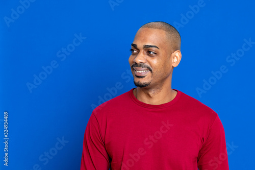 black, guy, blue, man, adult, people, person, african, male, red, american, isolated, background, white, studio, young, ethnic, photogenic, casual attire, afro, portrait, latin, gesture, coiffure, expression, shaven, t-shirt, colours, happy, joy, pleasure, smiling, friendly, enjoying, friendliness, funny
