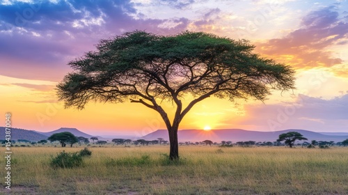 African Savanna Sunset: A Majestic Acacia Tree Silhouetted Against a Vibrant Sky