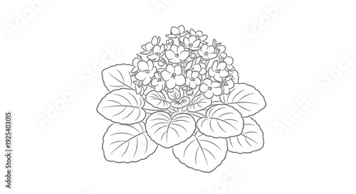 African Violet Plant Line Art Drawing - Blooming Houseplant with Leaves and Flowers