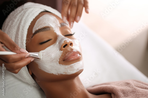 african, woman, receiving, professional, facial, skincare, treatment, modern, beauty, salon, cosmetologist, applying, moisturise, mask, warm, natural, lighting, clean, minimalist, interior, authentic, skin, texture