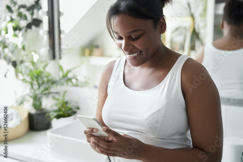bathroom, woman, african american, smartphone, mobile phone, relax, nudity, spa, standing, browsing, technology, texting, cheerful, smiling, hygiene, skincare, cyberspace, looking down, checking, well-being, bodycare, water, enjoyment, therapy, horizontal, one person, touching, female, pampering, morning