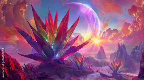 agave, plant, sky, landscape, sunset, pink, blue, yellow, surreal, neon, colourful, mountain, rock, horizon, fantasy, art, digital, illustration, planet, alien, earth, abstract, nature, light, glow, dreamy, hallucinogen, vibrant, high-coloured, bright, energetic, futuristic, cosmic, geometric