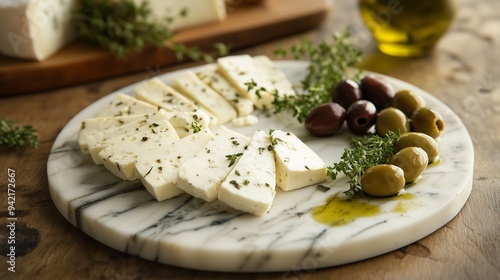 Aged goat cheese on a marble platter, garnished with herbs and olives, evokes a Spanish delight.