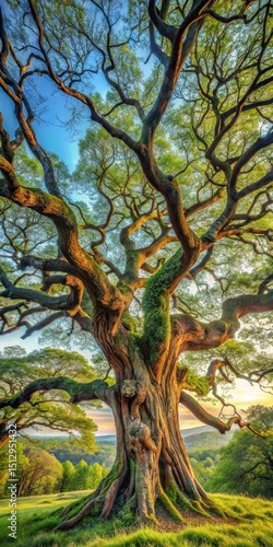 Aged tree standing strong in a serene landscape with gnarled branches and twisted trunk