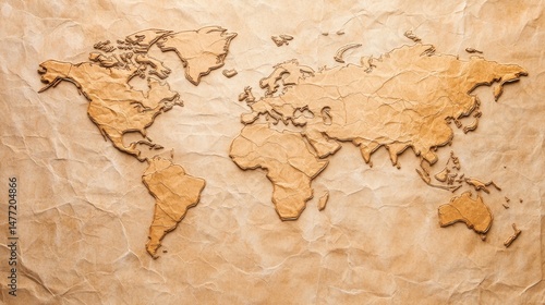 Aged world map on crumpled paper texture background. Vintage global travel history geography design template for presentations, websites, art.