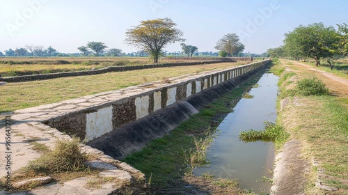 Agricultural canal dried up during severe summer drought heatwave, leading to water crisis stress on crops, highlighting the impact of climate change and long-term water shortages on rural farming